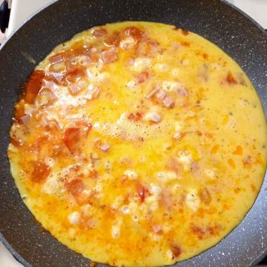 Аккуратно их раздвиньте и в центр сковороды выложите колбасу. Жарьте колбасу с обеих сторон до румяности. Залейте помидоры и колбасу молочно-яичной смесью. Накройте сковороду крышкой и держите на огне в течение 10 минут.