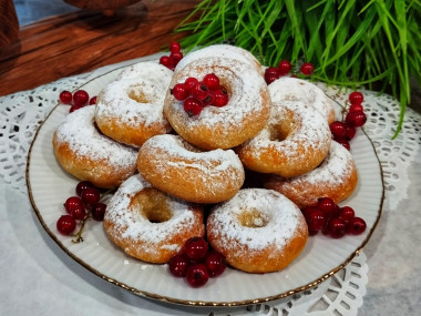 Готовые пончики охладите, посыпьте сахарной пудрой. Если у пончиков нижняя часть отверстий срослась, по желанию можно наполнить серединку джемом или вареньем. Я ничем не наполняла, так как у меня пончики сохранили свою изначальную форму, просто увеличились при выпекании в размере. Приятного аппетита!