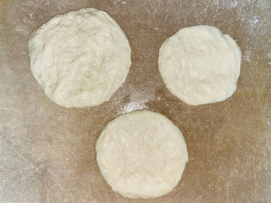 Смажьте руки и рабочую поверхность растительным маслом. Тесто разделите на три равные части, отщипывая по кусочку. Я взвесила тесто, оно вышло 330 граммов - я поделила его на три кусочка весом по 110 граммов. Каждый кусочек скатайте в шарик.