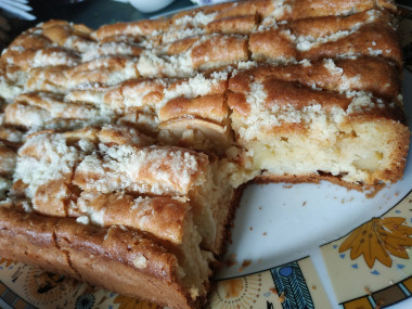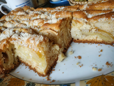 Выложите дольки яблок сверху пирога, вертикально погружая их в тесто. У меня получилось три ряда. В принципе, пирог уже можно выпекать в таком виде, но он будет еще вкуснее, если сверху посыпать его штрейзелем — песочной крошкой.