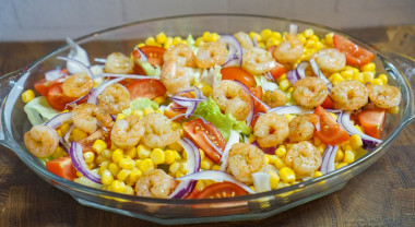 Салат получился просто волшебным! Свежие овощи, ароматная зелень, сладкая кукуруза и сочные креветки - просто божественное сочетание вкусов! Большое спасибо автору за рецепт! Забираю рецепт себе в заметки, буду готовить ещё!