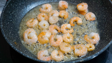 Креветки для салата можно замариновать самостоятельно. Для этого отварные, очищенные креветки поместите в глубокую небольшую ёмкость. Полейте 1-2 ст.л. растительного масла, добавьте 1 зубок чеснока, пропущенного через пресс, посыпьте прованскими травами и сбрызните соком 1/4 лимона. Всё перемешайте и оставьте на 10-20 минут.