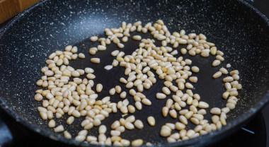 Кедровые орешки слегка обжарьте на сухой разогретой сковороде. Затем их остудите. Чем заменить кедровые орешки? Идеально подойдут обжаренные миндальные лепестки или кешью. Они тоже дадут приятный хруст и ореховый аромат.