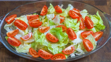 Листовой салат ополосните под проточной водой и тщательно обсушите бумажными салфетками. На листочках не должно остаться излишков влаги, это очень важно. Нарежьте айсберг толстыми полосками или кубиками, как вам больше нравится. Отправьте первым слоем на широкую тарелку.