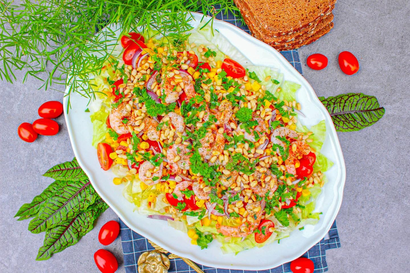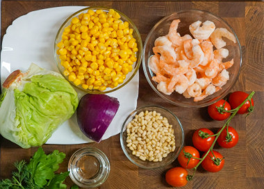 Первым делом, нарезала листья айсберга и выложила их в салатную миску. Сверху на айсберг выложила дольки томатов черри, перья синего салатного лука и консервированную сладкую кукурузу. Тем временем, на сковороде слегка обжарила кедровые орешки. На другой сковороде обжарила со специями замороженные креветки в течении нескольких минут до готовности. Здесь главное - не передержать, несколько минуток - и у нас вкусные сочные креветки!