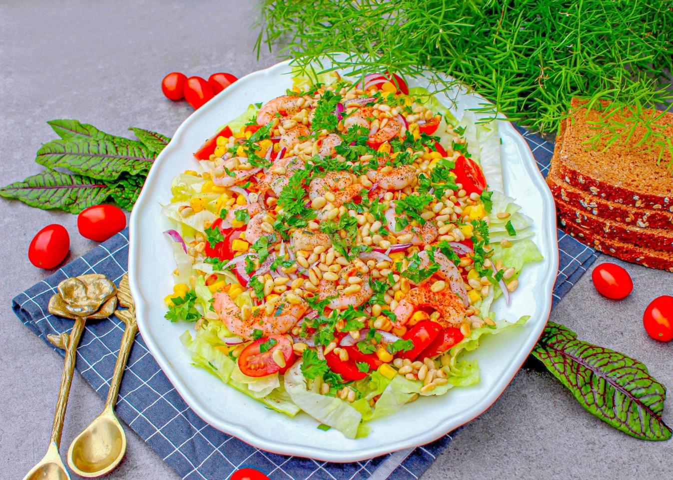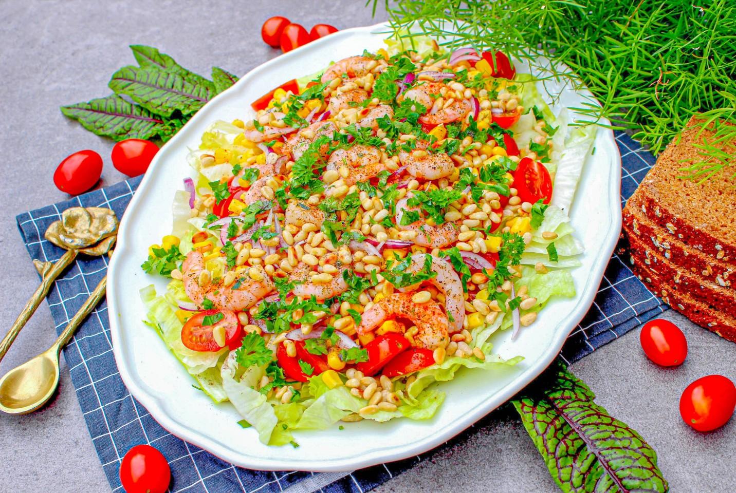 Сочетание морепродуктов с орехами — классика средиземноморской диеты, признанной одной из самых полезных в мире. Ваш салат с креветками — ее яркий представитель!