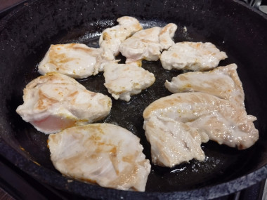 Готовое филе остудите и нарежьте тонкими ломтиками. Вместо обжаривания можете филе отварить или запечь в духовке в фольге. Вместо свежей курицы можете использовать копченую.