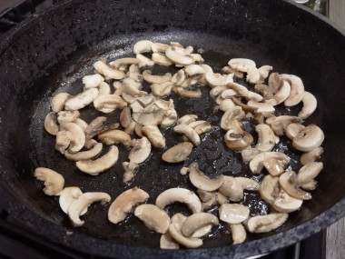 Шампиньоны вымойте, обсушите и нарежьте пластинками.