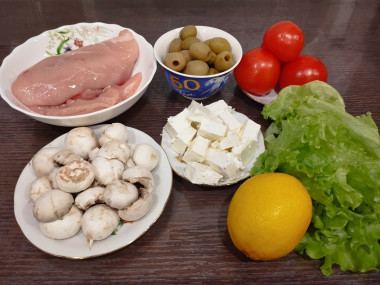 Как сделать салат с куриной грудкой, грибами и сыром? Очень просто и быстро! Для начала подготовьте необходимые ингредиенты по списку. Овощную часть можете дополнять или заменять по своему вкусу. Курицу можете заменить на любое другое мясо. Помидоры можете использовать обычные или черри. У меня небольшие бакинские помидорчики - они крупнее черри, но меньше обычных помидоров. Творожный сыр можете заменить другим мягким сыром: плавленым, фетой, моцареллой.