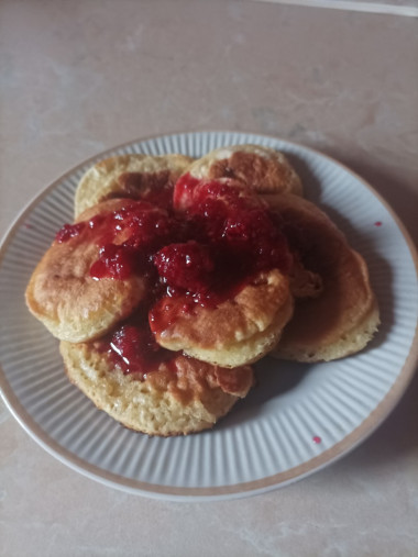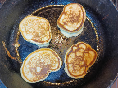 Жарила оладьи на чугунной сковороде на среднем огне примерно по 1-1,5 минуты с каждой стороны. Оладушки не прилипали и отлично переворачивались. Получились они мягкие, пышные, румяные, очень вкусные. Вкус соды не чувствуется. Подавала оладьи с медом, сметаной и сгущенкой.