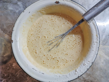 Начните порциями вливать яичную смесь в муку, постоянно перемешивая ее вилкой или венчиком. Тесто благодаря такому способу (вливать жидкую составляющую в сухую) получится более однородным. По консистенции оно должно получиться довольно густым, как сметана.