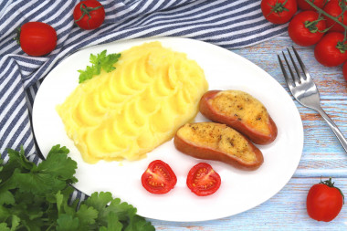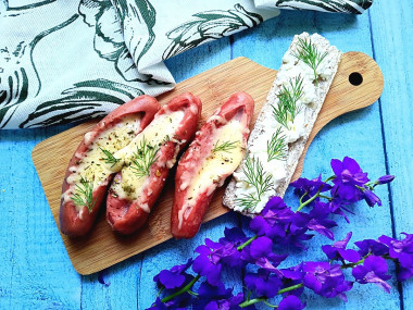 Подавайте сосиски сразу же пока они горячие и сыр тянется. Подойдет любой гарнир. Я подавала с картофельным пюре и свежей зеленью. Приятного аппетита!