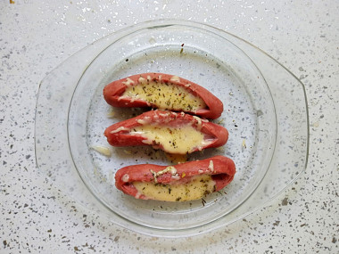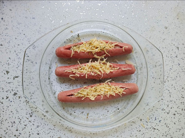 Сосиски очистите от заводской пленки. Каждую сосиску разрежьте посередине вдоль, не дорезая до краев 1 см. При этом нужно стараться не прорезать сосиски насквозь. Потому что в прорези может вытечь сыр при запекании.
