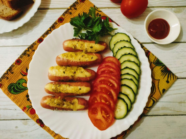 Сосиски брала свои любимые, немного подкопчённые. Сыр взяла твёрдых сортов. Из специй добавила хмели-сунели, чёрный молотый перец и смесь ароматных трав. Солить не стала, так как сыр и так добавляет солёность. В своей духовке запекала 15 минут, режим верх-низ без конвекции. Подала сосиски со свежими овощами и зеленью. Всей семье такие сосиски пришлись по вкусу!