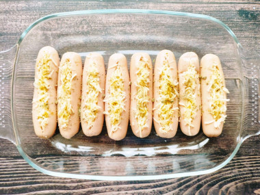 Сосиски начините тертым сыром. По желанию можете добавить в тертый сыр измельченную свежую зелень, майонез или пропущенный через пресс чеснок.
