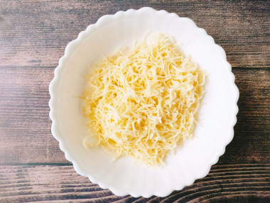 Сыр натрите на мелкой терке. У меня обычный Российский сыр. Также сюда подойдет моцарелла (рассольная и для пиццы), сулугуни.