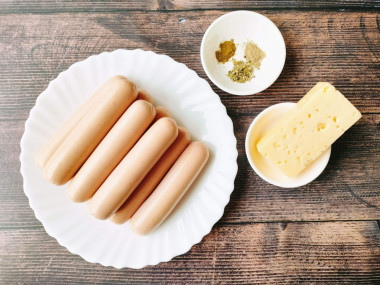 Как сделать сосиски, запеченные в духовке с сыром без теста? Для начала подготовьте необходимые ингредиенты по списку. Сосиски для блюда можете использовать любые. Но учитывайте, что они могут сильно повлиять на итоговый вкус блюда. Например, если возьмете сосиски с ярко выраженным копченым вкусом, то и все блюдо у вас тоже будет с легким вкусом копченостей. Если вам нужен нейтральный вкус, берите обычные сосиски, например молочные или сливочные.