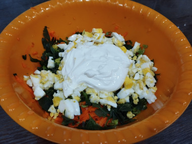 Салат морковь, яйцо, чеснок- это просто находка,когда нужно быстро и вкусно приготовить что-то вкусненькое. Нам очень понравился такой салатик и готовится за считанные минуты. Пока отваривались яйца, натерла морковь на крупной тёрке,измельчила чеснок. Яйца порезала мелкими кубиками. Смешала все ингредиенты,добавила сметану, соль,немного зелени сельдерея и петрушки, и перемешала.