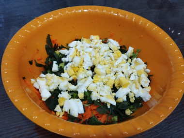 Яйца очистите от скорлупы и нарежьте маленькими кубиками. Отправьте яйца к морковке.