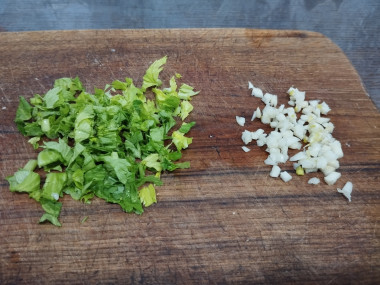 Зелень ополосните и обсушите. Нарежьте её максимально мелко. Для салата отлично подойдёт петрушка и укроп. Если у вас есть в наличии молодой зелёный лук, то используйте его тоже. Он придаст особую нотку и вкус. Посолите салат по вкусу и поперчите.