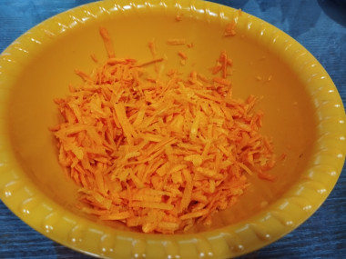 Морковку натрите на тёрке с крупными зубками или на овощерезке для корейских салатов. Отправьте в глубокую удобную тарелку.