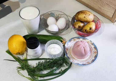 Калорийность продуктов: Картошка, Яйца, Огурцы, Редиска, Вареная колбаса, Сметана, Кефир, Минеральная вода, Укроп, Зелёный лук, Лимоны, Соль