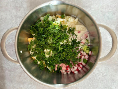 Минералку предварительно отправила в холодильник охлаждаться. Редис добавлять не стала. С огурцов срезала кожицу. Все ингредиенты нарезала небольшим кубиком. Зелёный лук и укроп мелко порезала. Соли мне показалось маловато, поэтому я добавила соль в окрошку. Перед подачей я дала окрошке настояться и охладиться в холодильнике. Блюдо получилось хорошее, с мягким вкусом.