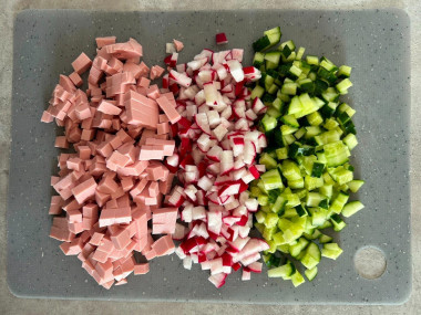 Варёную колбасу или ветчину нарежьте так же кубиками и отправьте к редису с огурцом.