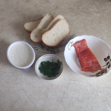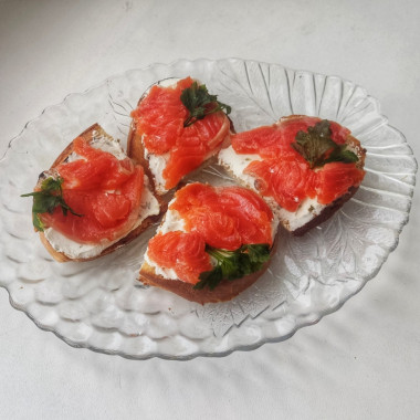 Кусочки батона смазала творожным сыром, выложила рыбку,украсила листочками петрушки и выложила на сервировочную тарелку.