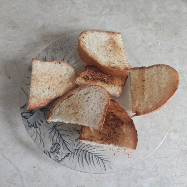 Хлеб нарежьте на кусочки толщиной около 1 см. Если у вас багет, то режьте по диагонали, чтобы кусочки получились подлиннее. Поджарьте хлеб на сухой сковороде по минуте на каждой стороне — он должен стать хрустящим. Вы можете также использовать сковороду-гриль или подсушить хлеб в духовке на противне. При желании намажьте одну сторону хлеба сливочным маслом, тогда кусочки получатся румяными.