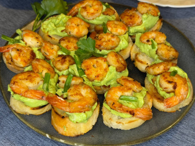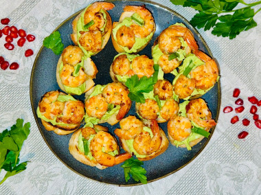 К праздничному столу приготовила вкуснейшую закуску по рецепту брускетты с авокадо и креветками.