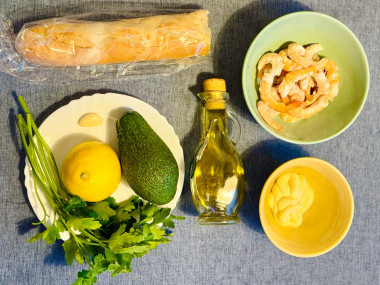 Как сделать брускетту с авокадо и креветками? Очень просто и быстро. Для начала подготовьте все необходимые ингредиенты по списку. Вместо багета можете использовать обычный батон.