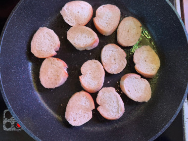 Все делала по рецепту, с маленькими отклонениями. Ломтики багета подсушила на сковороде, так как духовка была занята. В той же сковороде жарила креветки.