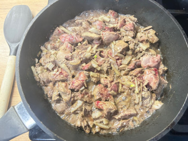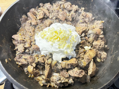 Лук, печенку и грибы я нарезала и последовательно добавляла на сковородку тушиться. Тушилось все это под крышкой в собственном соку минут 15-20. Вместе со сметаной и чесноком я долила чуть-чуть водички, чтобы гарнир можно было «поливать».