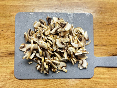 Шампиньоны хорошо промойте от загрязнений. Нарежьте шампиньоны на части. Можно нарезать их слайсами или просто разрезать каждый грибок на 2-4 части.