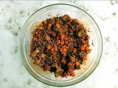 В подходящей по размеру емкости соедините обжаренные овощи, мясо и гречку. Все посолите, добавьте приправы и специи, перемешайте.