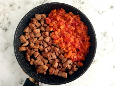 Добавьте на сковороду помидор, перемешайте. Потомите овощи 1 минуту и переложите на тарелку. Не нужно доводить овощи до полной готовности, чтобы они не перепрели при дальнейшем приготовлении в духовке.