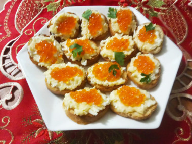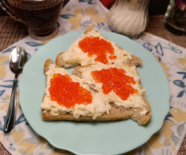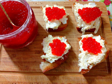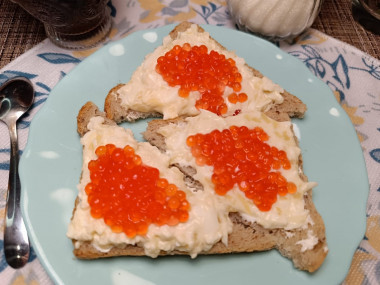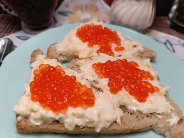 Необычный рецепт бутербродов с красной икрой , делала на завтрак ребенку в школу , так как дочка любит бутерброды с расплавленным сыром , я подогрела бутерброды в микроволновке, сыр слегка расплавился , получилось очень вкусно и с чаем и с кофе с утра очень изысканный завтрак , обязательно сделаю такие бутерброды на новый год .