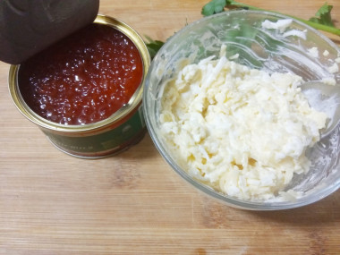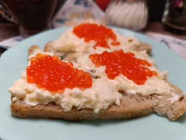 Сочетание красной икры, майонеза, сыра и яйца я попробовала впервые. Оказалось, очень даже интересно. Необычно, но вкусно. Майонезно-сырная намазка оттеняет вкус икры, делая его более ярким.