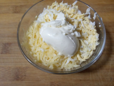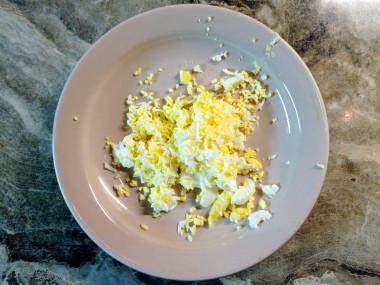 Яйца сварите вкрутую, охладите и очистите. Натрите яйца на мелкой или средней терке.