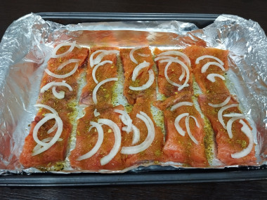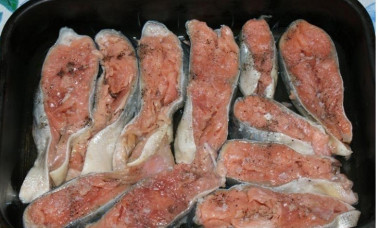 Горбушу очистите от чешуи и ополосните под проточной холодной водой. Обсушите кухонным полотенцем. Выложите кусочки рыбы в подходящую по размеру форму для запекания. Посолите по вкусу и поперчите. Налейте немного воды, так, чтобы она покрывала дно формы примерно на 3-5 мм.