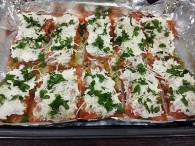 Выложите сыр с майонезом на каждый кусочек горбуши. Посыпьте равномерно сверху оставшимся тёртым сыром.