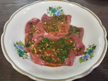 Обмажьте стейки полученным маринадом. Массирующими движениями вотрите ароматную смесь по всей поверхности мяса. Отправьте говядину в пищевой пакет и оставьте при комнатной температуре на 30-60 минут. За это время стейки напитаются ароматами специй и трав. Можно мясо отправить в холодильник на несколько часов для маринования.