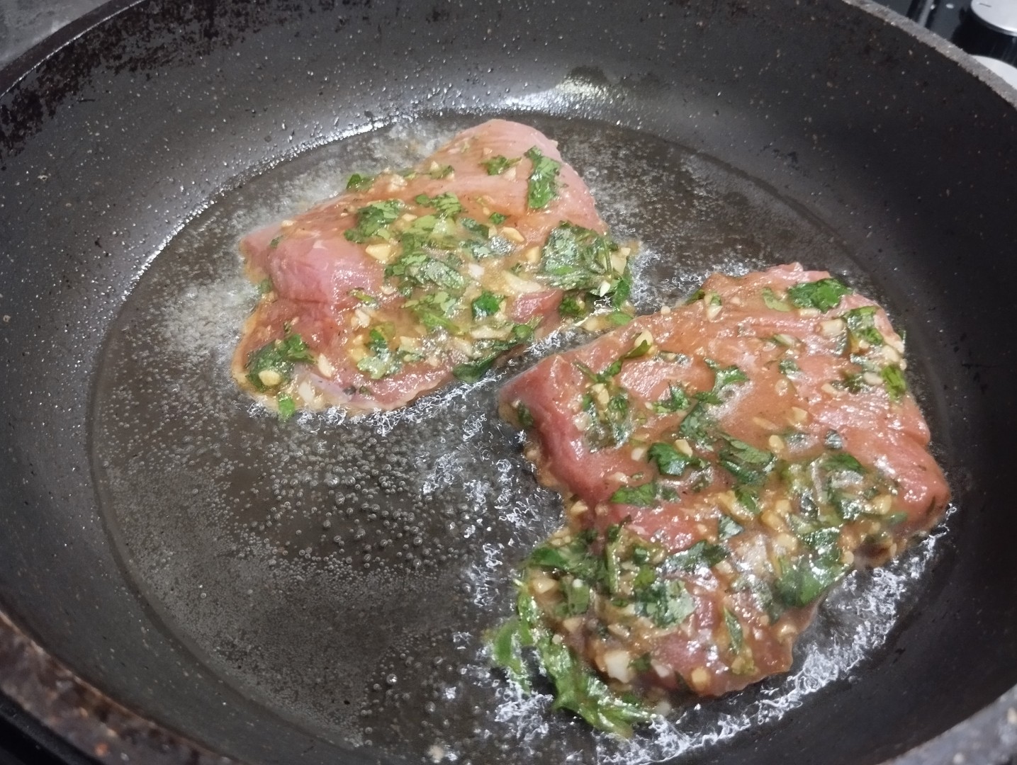 Сковороду с толстым дном хорошо разогрейте. Отправьте маринованные стейки обжариваться. На среднем огне готовьте без крышки от четырёх до семи минут . Время обжаривания зависит от толщины стейков и от того насколько прожаренное мясо вы хотите получить в итоге. Я готовила около 4х-5ти минут. Переверните мясо и жарьте ещё 4-7 минуты.