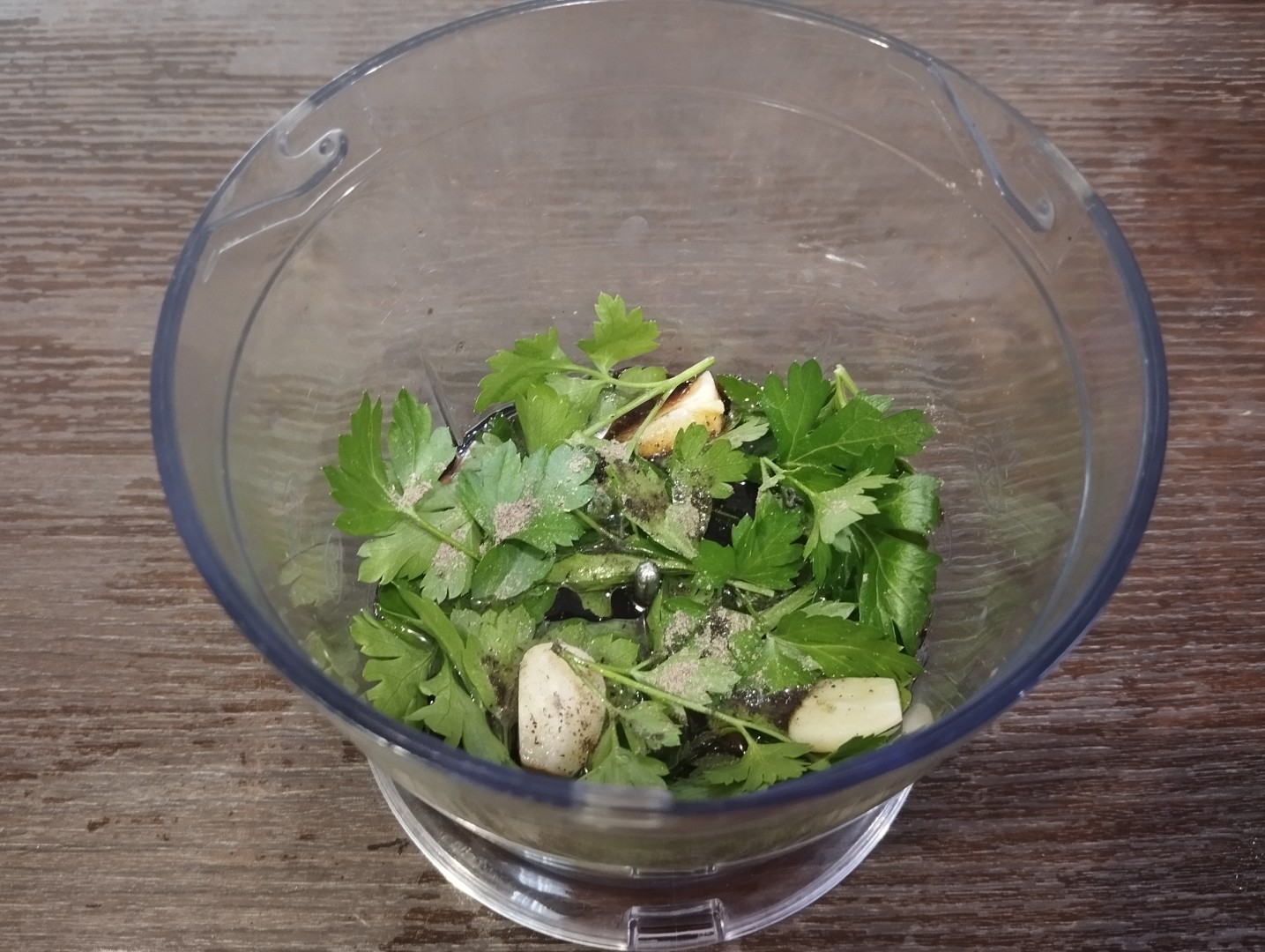 Зелень ополосните и обсушите бумажными салфетками, чтобы убрать остатки воды. Отправьте тимьян, петрушку и листочки мяты в чашу. Я использовала две небольшие веточки мяты, если использовать мяты больше, то в готовом блюде она оттеснит вкус мяса, поэтому возьмите мяты не слишком много.