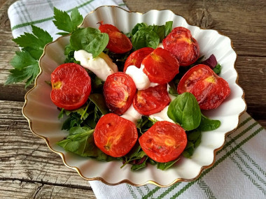 Сверху распределите еще теплые обжаренные помидоры. Салат слегка посолите и сразу же подайте к столу. Приятного аппетита!
