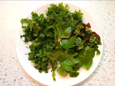 Смесь салатных листьев можете взять готовую магазинную или сделать самостоятельно из той зелени, которая у вас есть. У меня салатная смесь Месклам (молодые листики рукколы, полевого салата, шпината, Лолло Бьонда и Лолло Россо). Очень вкусное сочетание.