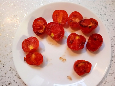 Помидоры черри нарежьте половинками. Если у вас обычный помидор, то нарежьте его дольками. Место среза слегка присыпьте сахаром. Помидоры нужны плотные. Мягкие плоды плохо держат форму, в процессе нарезки и приготовления они расползутся в бесформенную массу и испортят внешний вид блюда.
