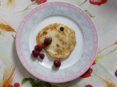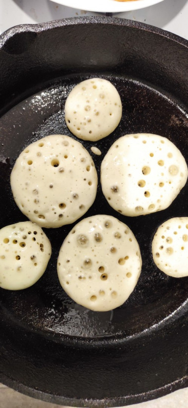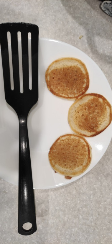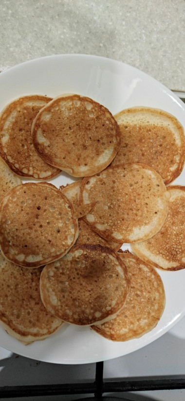 Тонкие, маленькие оладушки. В тесто я добавила немного ванильного сахара. Первый раз я делала на три порции, оладьи ушли нарасхват. Второй раз тесто увеличила в два раза, но также ничего не осталось)