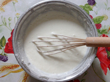 Готовила я сразу на шесть порций. Кефир использовала 1%-ный. Все ингредиенты смешала. Муки понадобилось девять столовых ложек вместо шести.